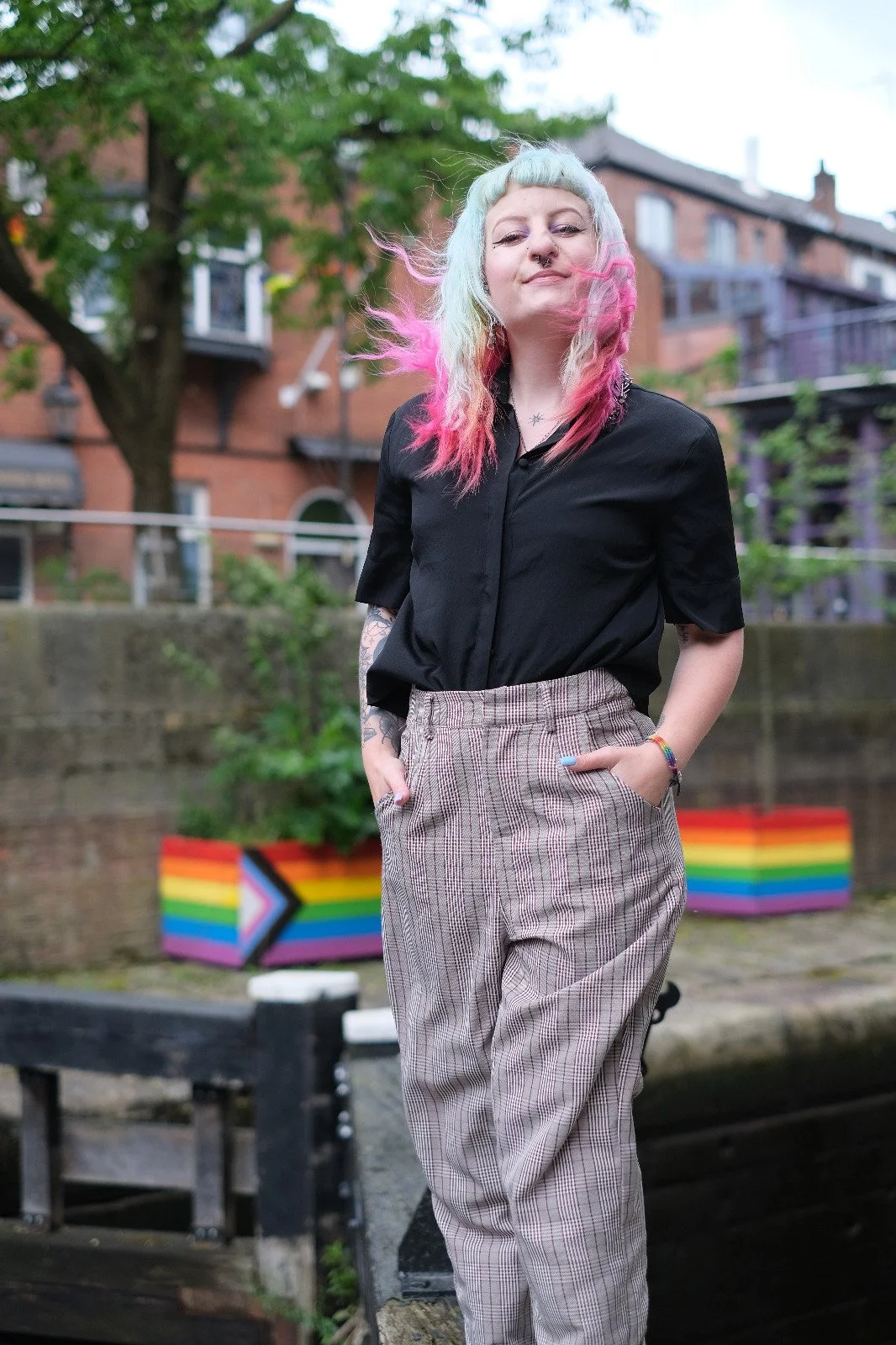 Description: Tasha is standing in Manchester’s gay village along the canal, she has her hands in her pockets and they are smiling. There are some rainbow plant boxes behind them and she is wearing checked pants and a black shirt with turquoise and pink hair.