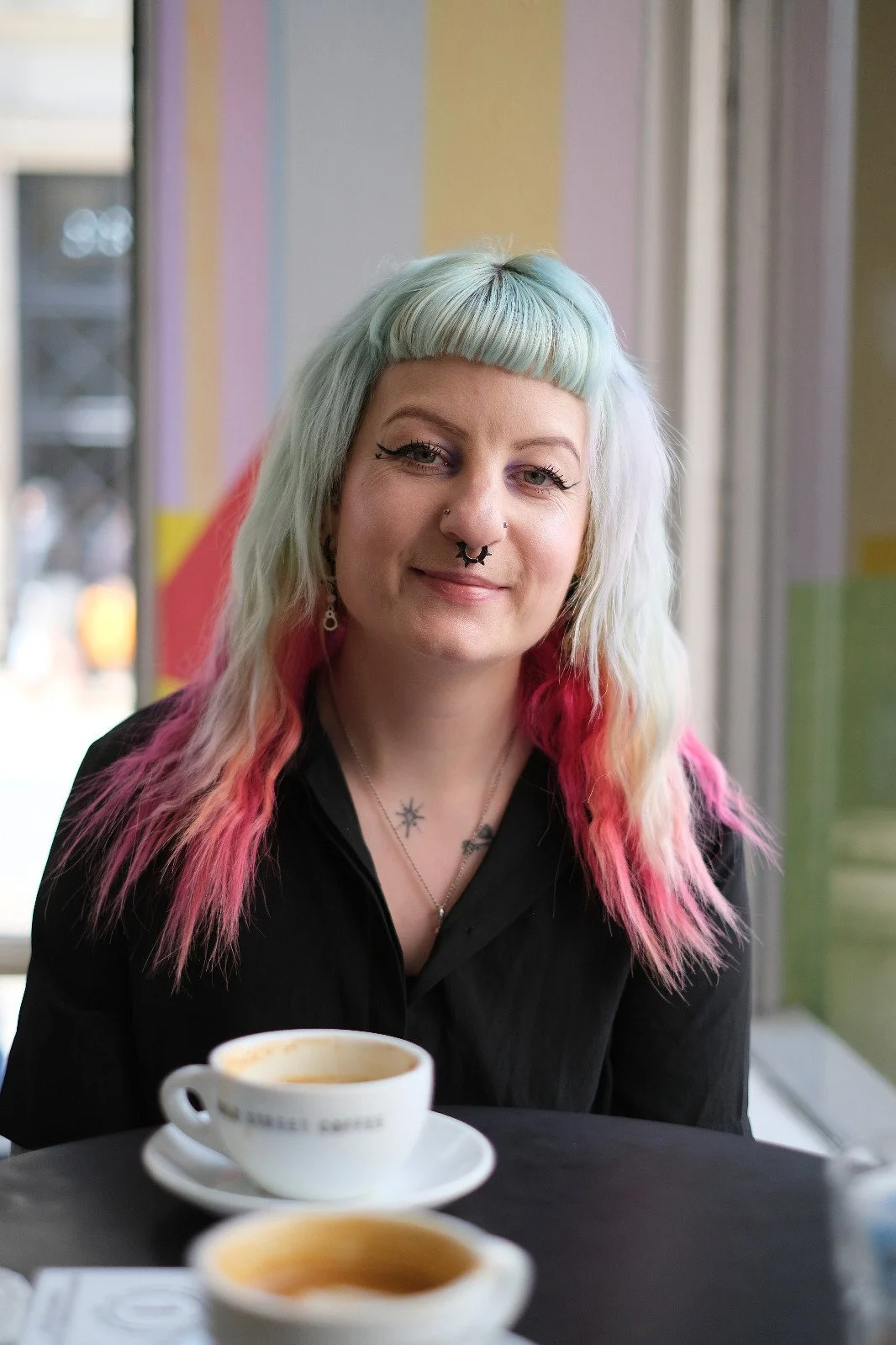 Description: Tasha is sat in a local Manchester cafe with a coffee, smiling and is wearing a black shirt and has turquoise and pink hair.